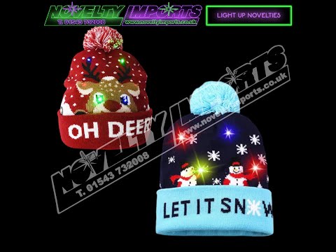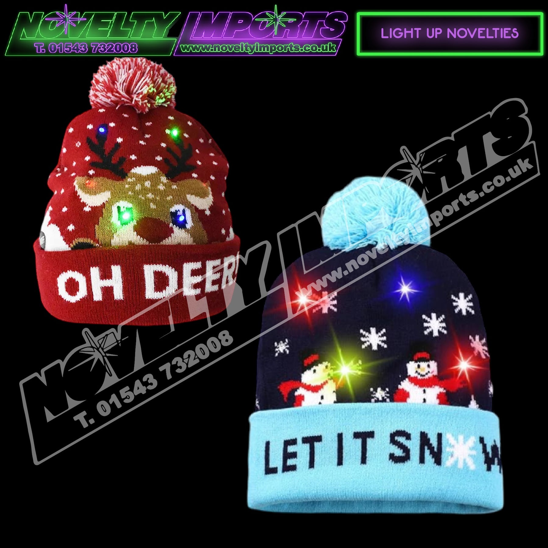 Just Beautiful! Look at these all NEW flashing adult Christmas Festive LED plush knit beanie pom pom hats, these come in 2 mixed designs as shown "Oh Deer" and "Let It Snow" both have 6 flashing multicoloured LEDs that flash in 3 different pattern functions. They come complete with NON - REPLACEABLE batteries with a protection tag ready to go. NOT A TOY 12/pc bags and 27/pc cartons.