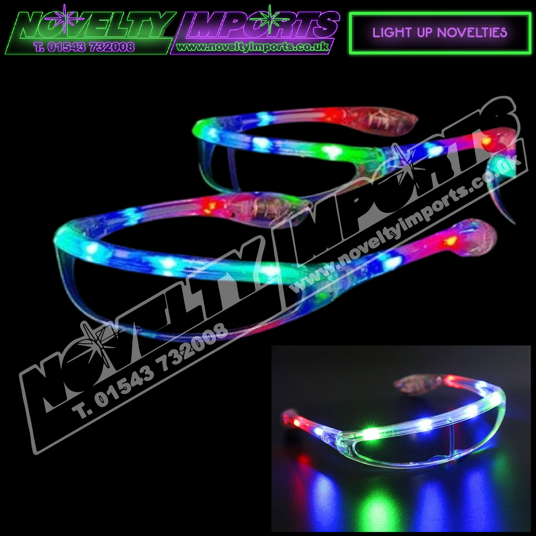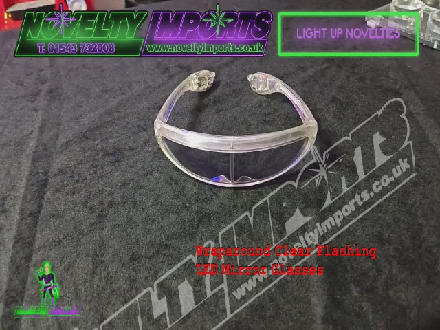 NEW FOR THIS SEASON! A festival classic, popular at so many music and dance festivals and large concert events. The all-new LED flashing wraparound mirror glow glasses. Clear plastic with 8 flashing red/green/blue LEDs with three flash patterns: slow, fast and static. Comes complete with free pre-fitted replaceable AG13 watch batteries with a protection tab. 1/pc bag packing 24/pc inner bag and 144/pc to a full carton.