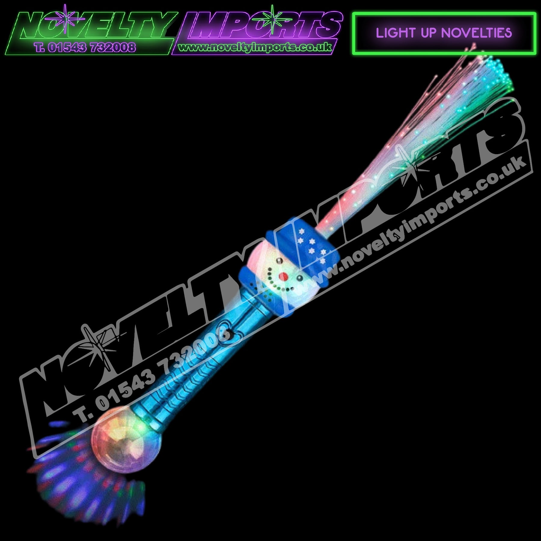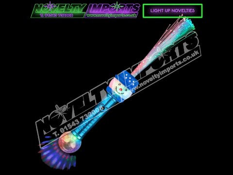 NEW FOR THIS SEASON. These are beautiful! A new item for this year is the snowman fibre optic ball wand. This item has a blue chrome effect mirror handle and has three pattern functions. An array of brightly lit fibre optic strands light up red, green and blue whilst the projection ball floods the floor with colour rays. A fantastic school PTA and charity fundraising light up novelty for Christmas light switch on festive disco's illuminated walks etc. Approx 15" (inch) in height, it comes complete with 4 x free replaceable AG13 cell batteries with a battery protection tab ready to go. 1/pc bag packing 24/pc inner carton and 96/pc to a full carton.